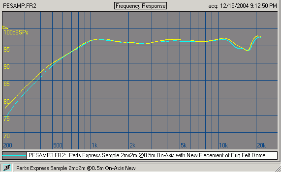 The effect of this is to maintain the function of the shield, but reduce the resonances that it invariable creates under the shield, between the shield and the dome. The felt is not nearly as reflective as the hard plastic, so it absorbs some of the signal rather than reflecting it. The small opening is too small to allow much through, but I did this in an attempt to relieve the pressure of the wave, further reducing the resonances. It seems to be partially successful (below). It may even be debatable as to whether or not this is an improvement, but I feel that a smoother 10K+ result is possible with a slight flattening below 10K.