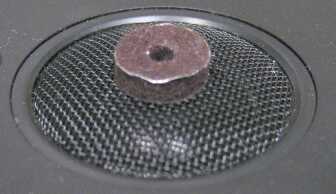 The phase shield is a small, circular plastic piece with self-sticking glue on one side. It's attached on the inside, so the top portion of the driver with the shield must be removed. The phase shield is first removed, then the cover replaced. Next, a small piece of felt (real wool or synthetic) with a small hole cut out of the center is placed onto the mesh on the outside. This piece should be a diameter similar to the original shield.
