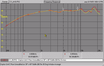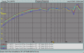 The graphs here are for this unit on the flat panel. There is a characteristic dip from 3 to 5 khz which seems to be typical of this model. This will be considered when selecting baffle dimensions and positioning of the driver on the baffle. |