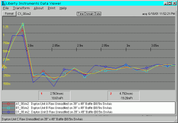| These are the on-axis impulse responses of all four units overlayed and expanded for easier viewing. The full size graphs show the full impulse response of each unit overlayed. Two more graphs show the impulses from Unit C only, using the on-axis and +/- 15 dgree responses overlayed.