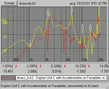 To this end, I attached a small plastic-cased accelerometer to the faceplate of several of the drivers. Two conditions were tested, one with the driver unmounted and on its back plate lying flat and the other with the driver mounted in a very small, 1.5" thick small baffle lying on its back. The results for Unit C (an original version) are shown, both a frequency response and CSD (waterfall) plots. The differences are striking.