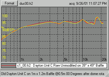 These Daytons appear to be a hybrid. They look like the MDT-29 motor (no chamber) but the dome/faceplate is very close to the MDT-32. That's how I got the idea to try a replacement dome, to see how much influence there is in it. The graph shows the importance of the dome/voice coil combination. The MDT-32/33 dome is the only one which can be used as it is the only one with the voice coil connectors attached to the dome assembly. The MDT-29 and -30 have the voice coil connectors attached to the motor assembly top-plate.