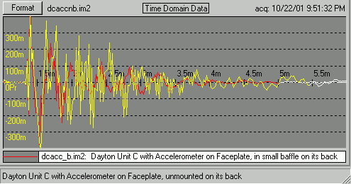 In the first few micro-seconds the signal looks identical. From there the two diverge drastically. At first they just look like variations in resonances. By the time they reach 5 msec, it's obvious that the baffle is damping the ringing which continues in the unmounted situation. The time-limited frequency response curve is shown below.