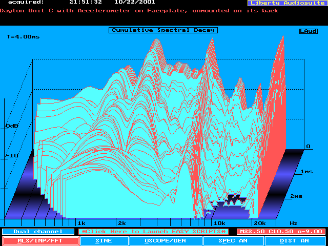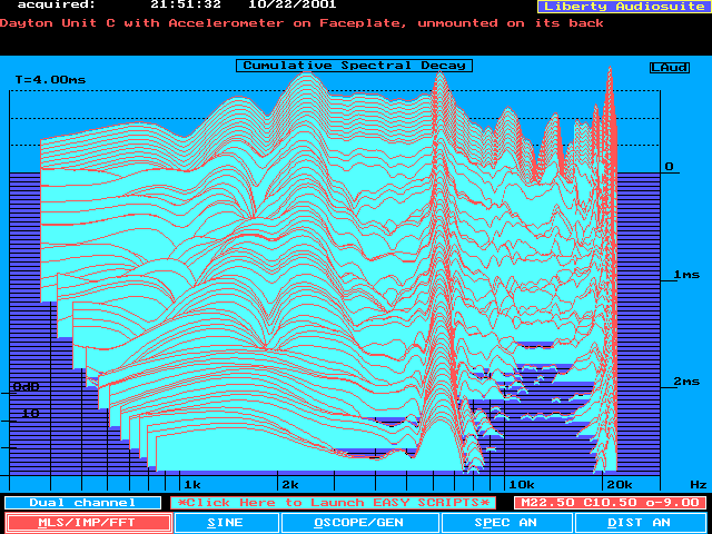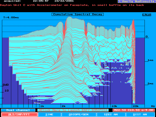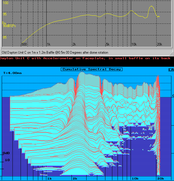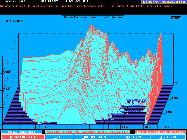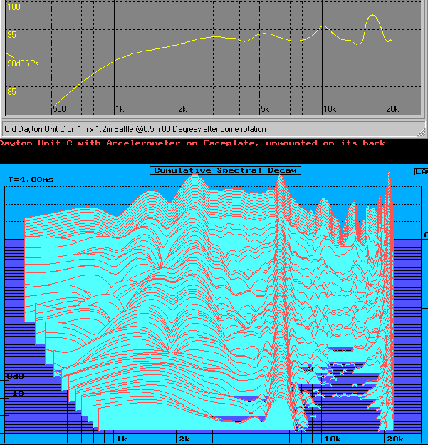The first two plots below show the CSD for the driver itself, no baffle mounting, and for the driver mounted on the small baffle. These used the default graph settings. I found it somewhat difficult to evaluate, so I changed the display to be 0 degrees horizontally, with maximum tilt vertically (70 degrees). This makes the resonant ridges (and their associated frequency) easier to determine.