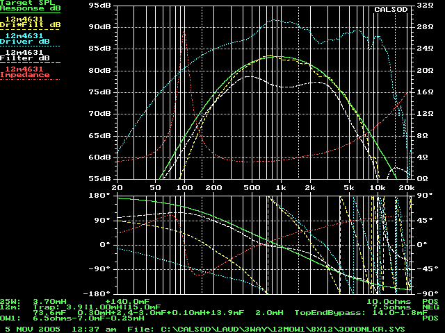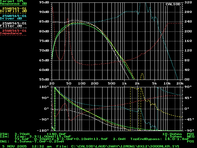 Next I set up the CALSOD file with the starting values taken from the PCD. After experimenting with topology changes, I settled on the design presented here, a 2nd Order Linkwitz-Riley for both crossover points (Fc). The Fc frequencies are 300Hz and 3,000Hz.