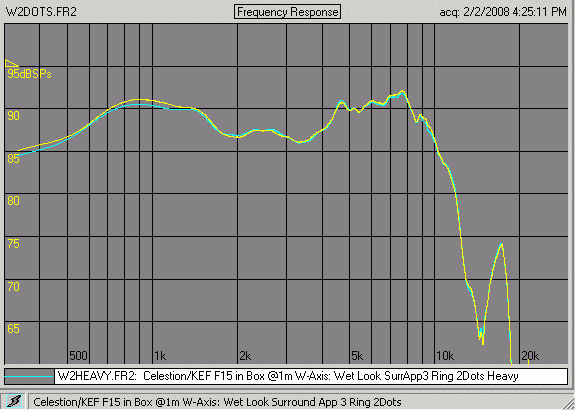 Adding the dots is a bit more problematic in that each driver is going to react to any and all added mass differently, much more so than it will for the surround tweak. The really good thing about it is that it is totally reversible. Painted lines or other distributed mass applications are not likely to be nearly as effective for many if not all drivers from what can be seen here. No driver should be modified with added mass unless it can be measured afterwards to document the changes and ensure that it's not just shifting resonances. At worst, resonances may be worsened or new ones introduced.