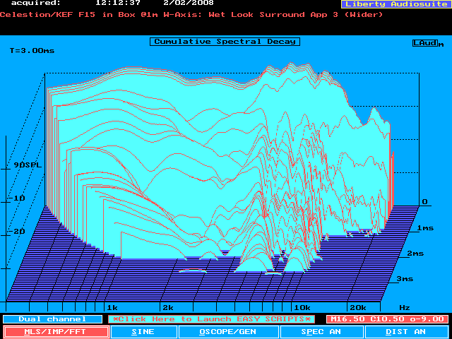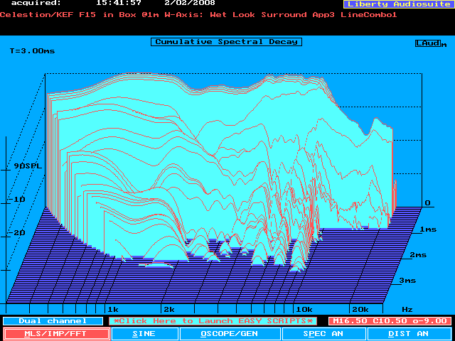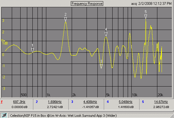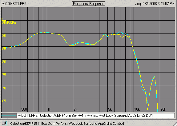 The improvement is significant. The dip at 1.7KHz, while not fully controlled, is reduced close to 3db to the point that its influence with a crossover in place will be minimal. The side benefits of the application are that the upper resonances are partly controlled while the tiny bumps noted between 2K and 4K are essentially eliminated altogether. Curiously, a resonance seems to be introduced at about 9.5Kz, though it's small and will be insignificant with a crossover in place. No further applications were made to the surround, though it may be possible to get more improvment and it will certainly be at the point of diminishing returns.