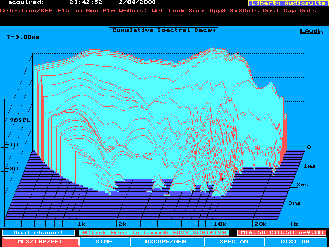 The best result is arguably the one shown below. It's the surround application with three sets of different dot pairs on the cone and a pair on the dust cap. Each pair was placed at different spacings from former to surround. I chose them because I hoped to attack the resonances at different points for each. This seems to have worked and is how they will remain. With a new crossover in place I don't expect there to be any loss in system sensitivity other than what I may change for my own purposes.