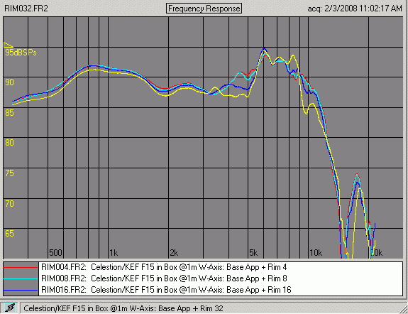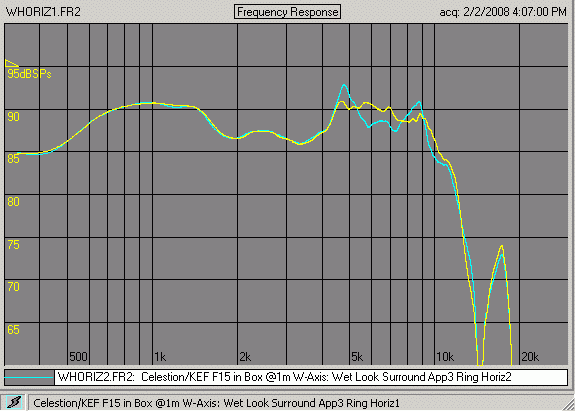 There are also many very tiny bumps in the frequency response between 2K and 4K. These will be shown to be directly related to the surround termination as well. What's not clear is how much is strictly the main cone and how much is the dust cap reacting to resonances of the main cone, since any main cone resonances will become part of what energizes the dust cap. Since the cone and dust cap are inherently closely coupled, there's no way to know precisely what resonances are strictly related to one or the other. The same holds for any similar driver such as a full-range driver with a whizzer cone.